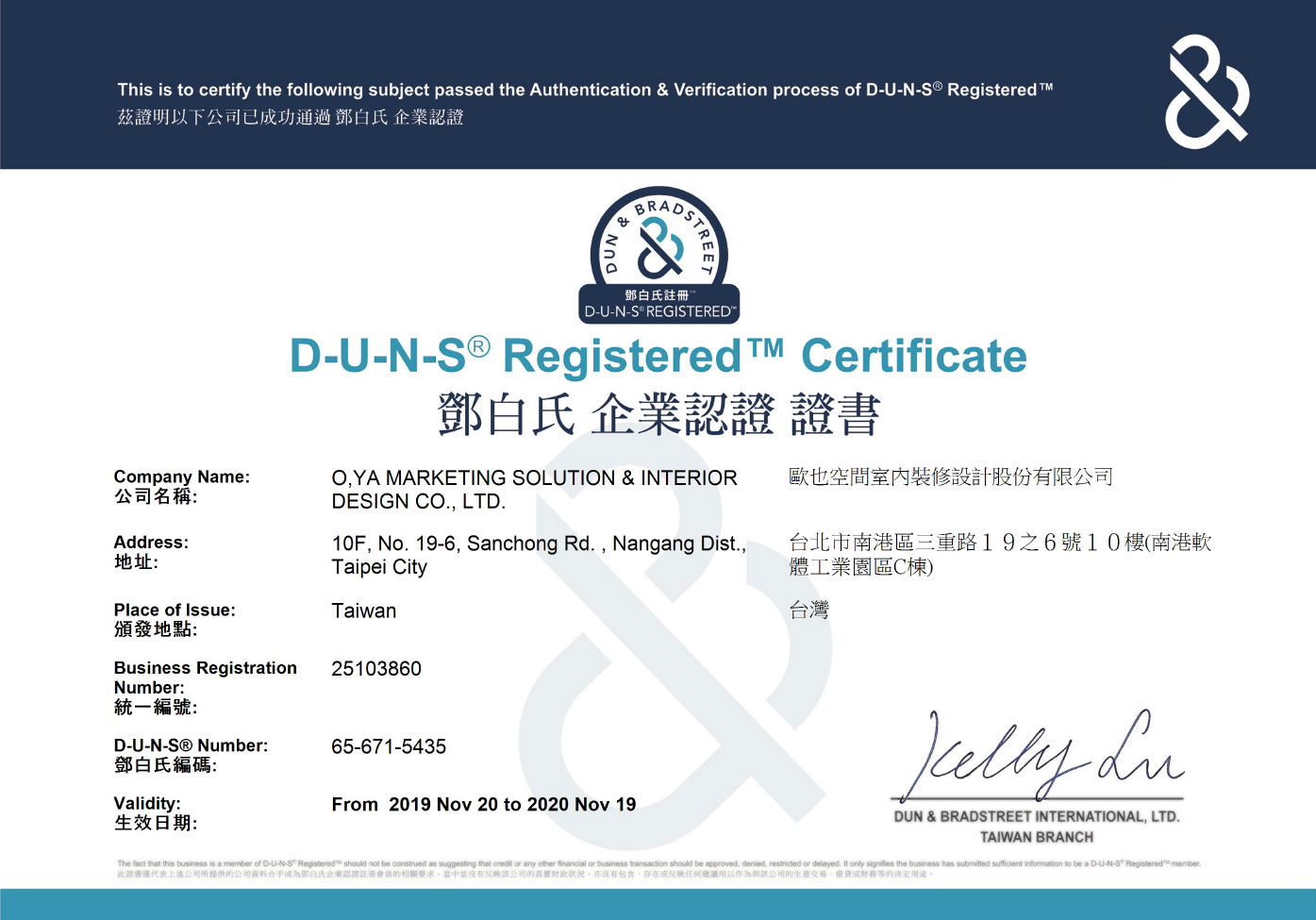 O'YA has passed the authentication & Verification process of D-U-N-S® Registered™.
